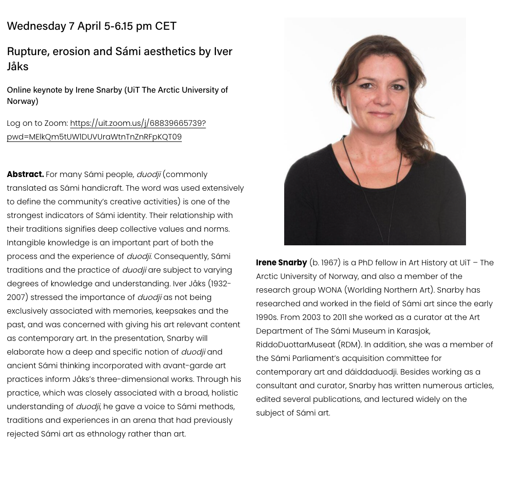 “Rupture, erosion and Sámi aesthetics by Iver Jåks” Irene Snarby 7 April 2021, 5 pm CET
