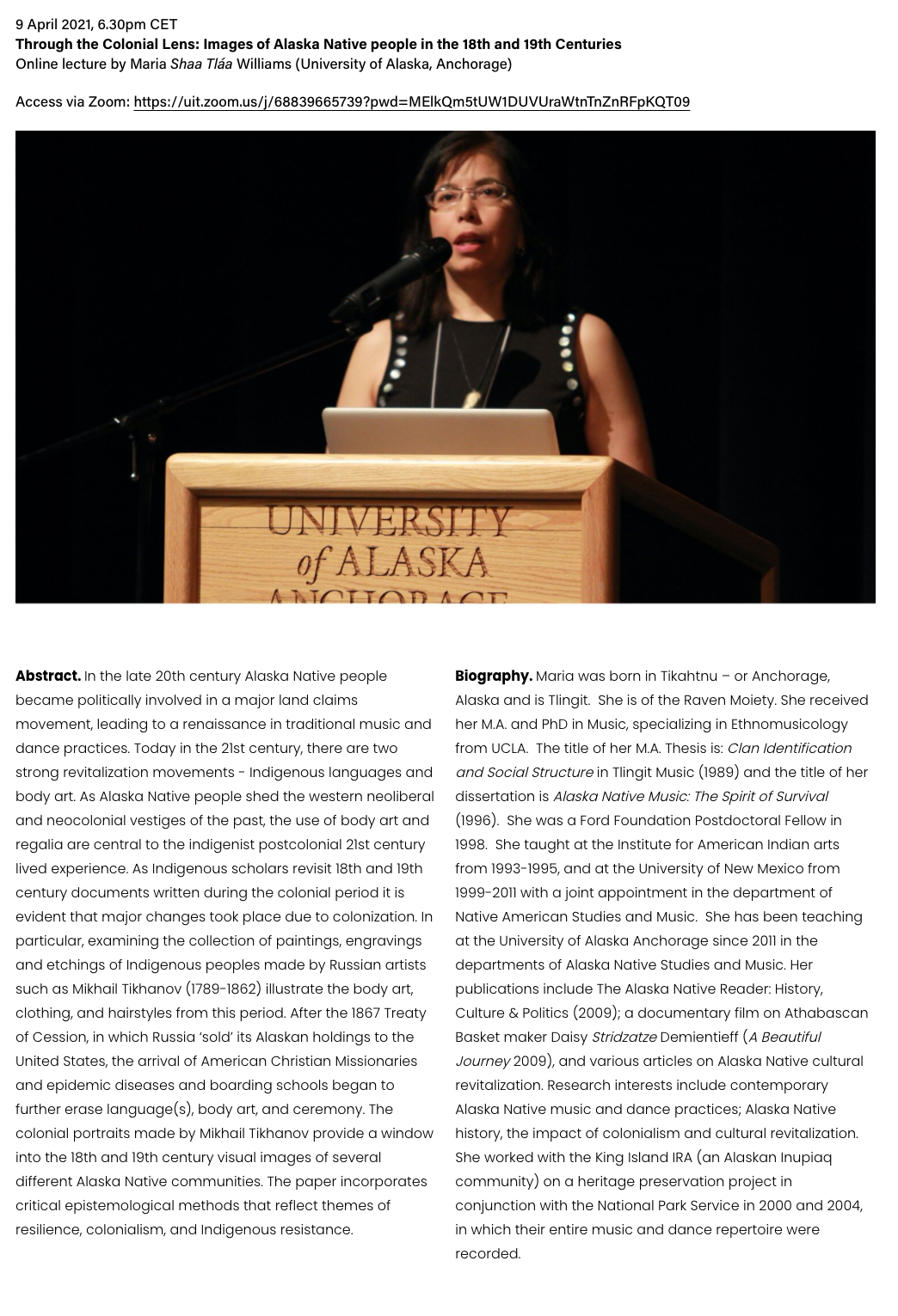 “Through the Colonial Lens: Images of Alaska Native people in the 18th and 19th Centuries” by Maria Williams 9 April 2021, 6.30pm CET